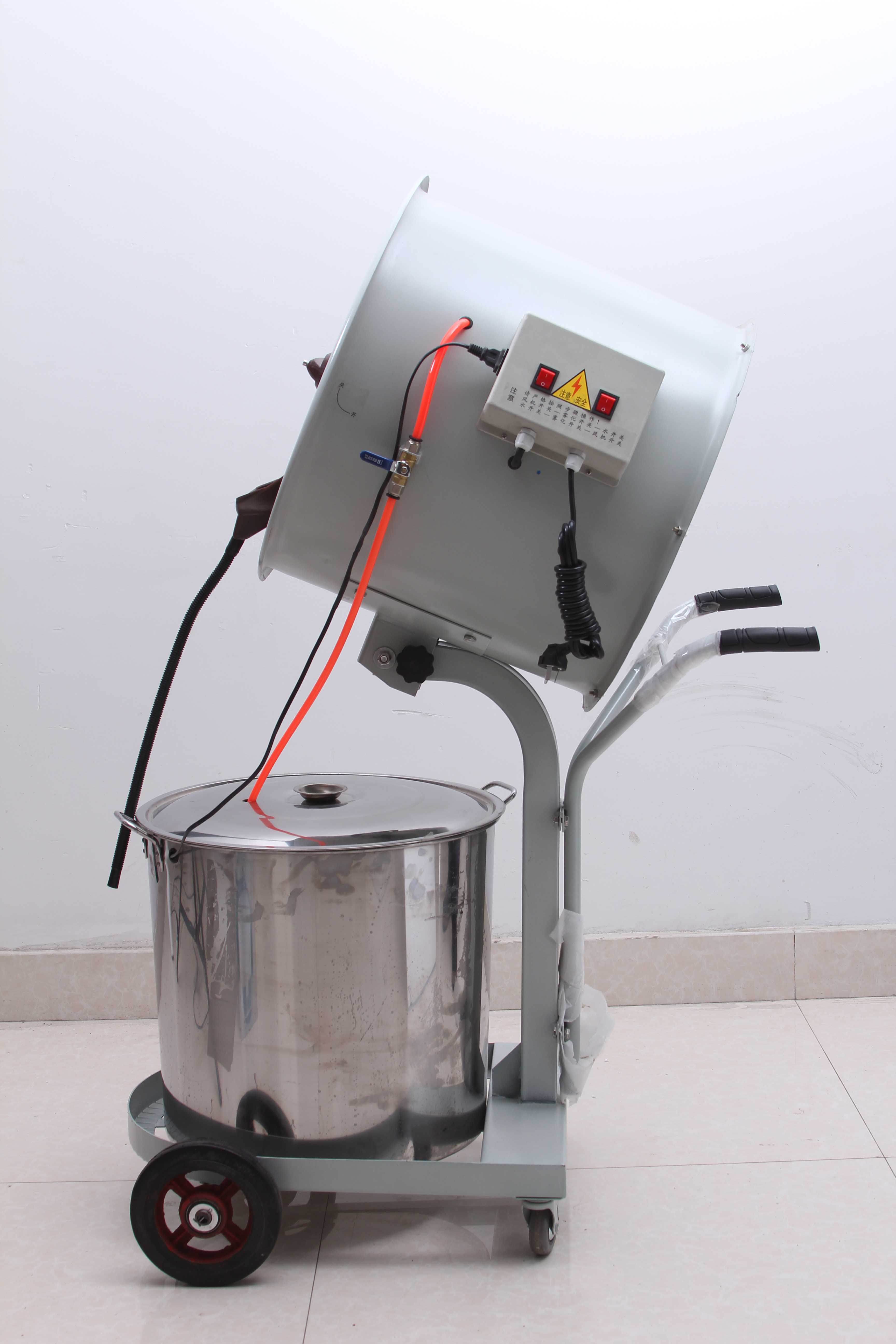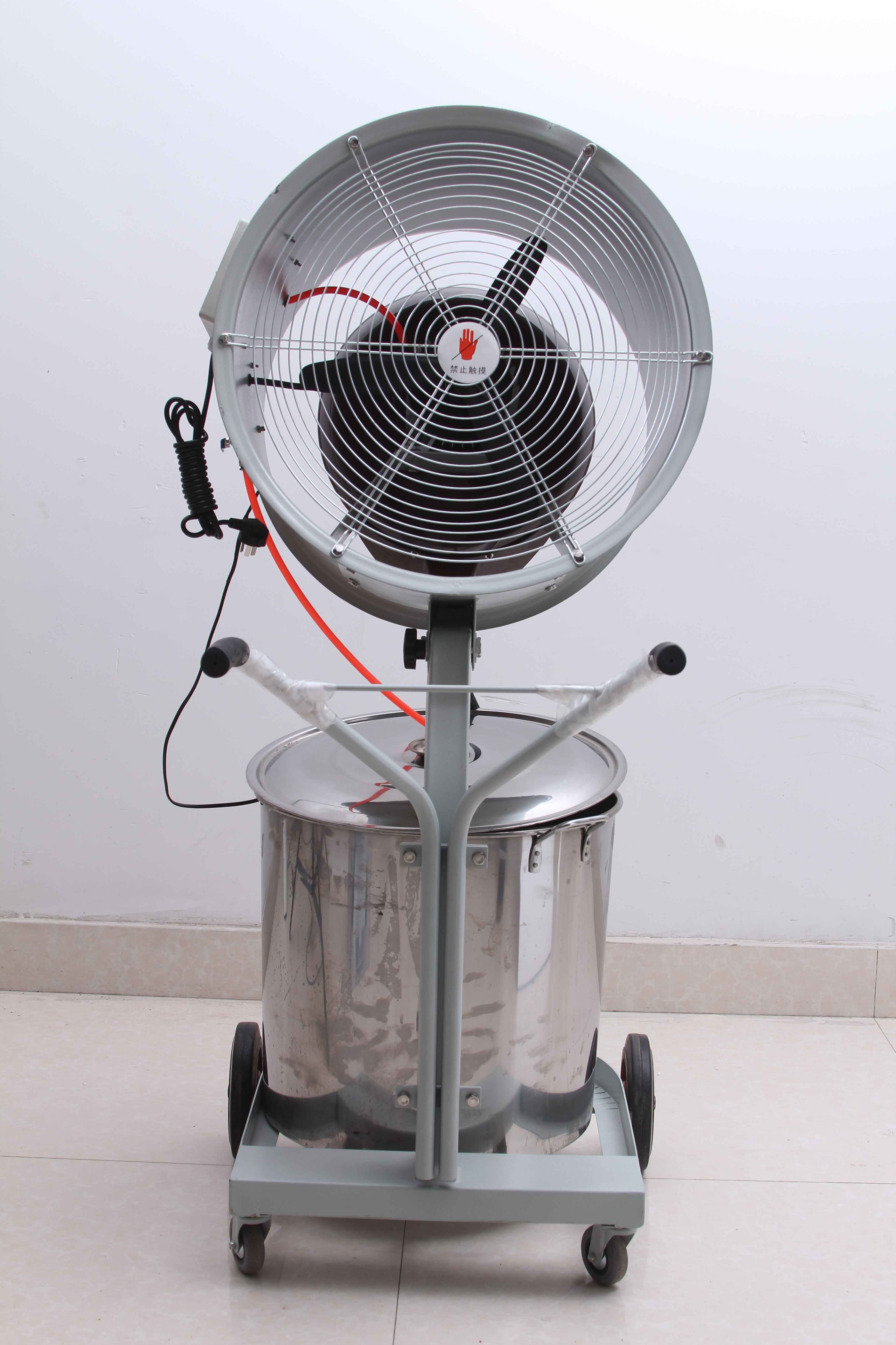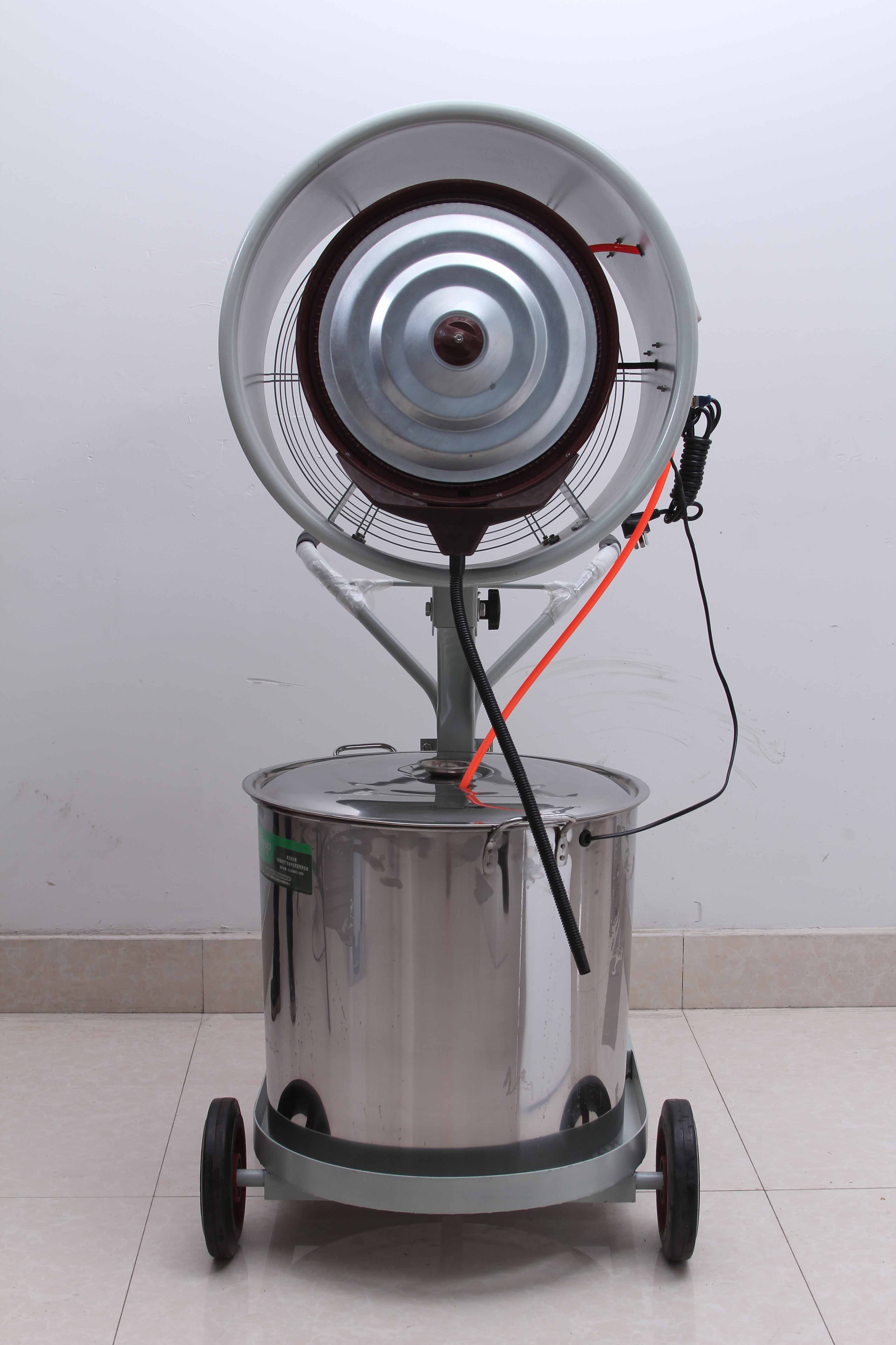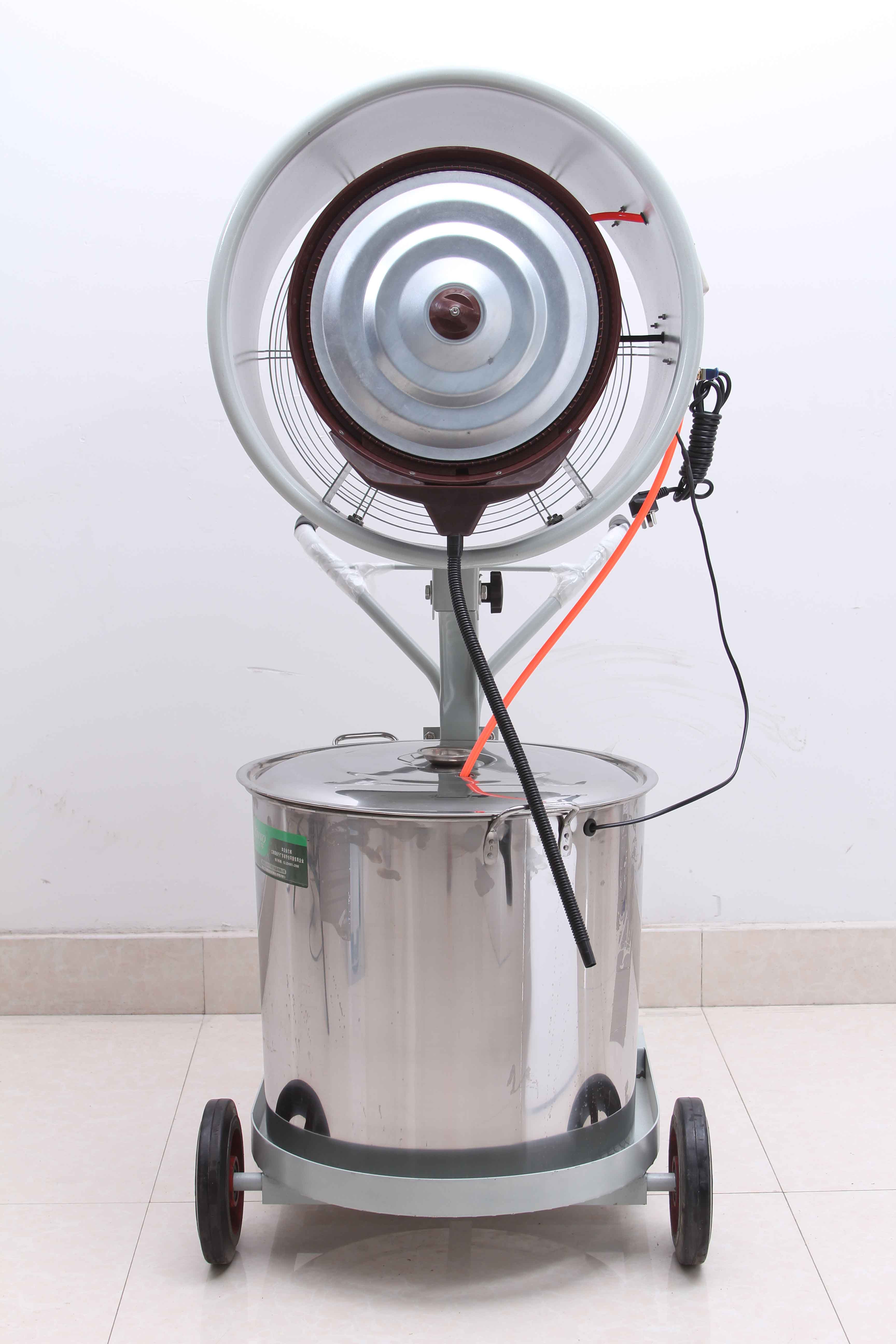 XH-9002离心式畜牧养殖加湿喷雾器:单电机,喷漆,金属圆筒,塑料风叶(噪音大),普通轮胎,缺水自动保护